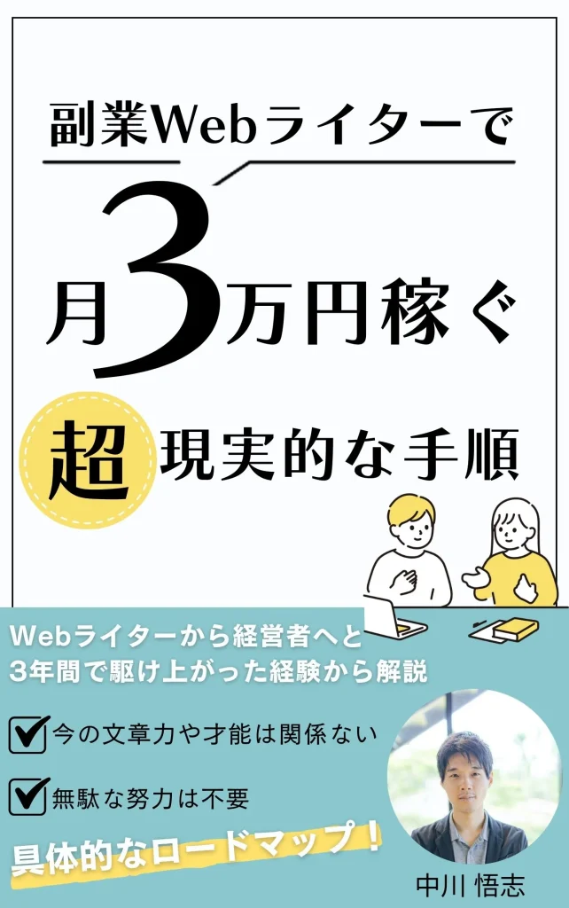 稼げるWebライターになりたい人の第一歩として、本記事の監修『中川 悟志』のKindle本「副業Webライターで月3万円稼ぐ超具体的な手順」をぜひダウンロードしてみてください。